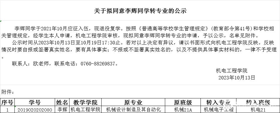 关于拟同意李辉同学转专业的公示