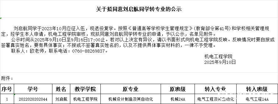 关于拟同意刘启航同学转专业的公示